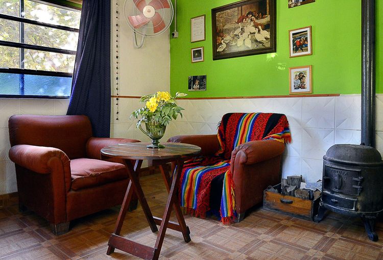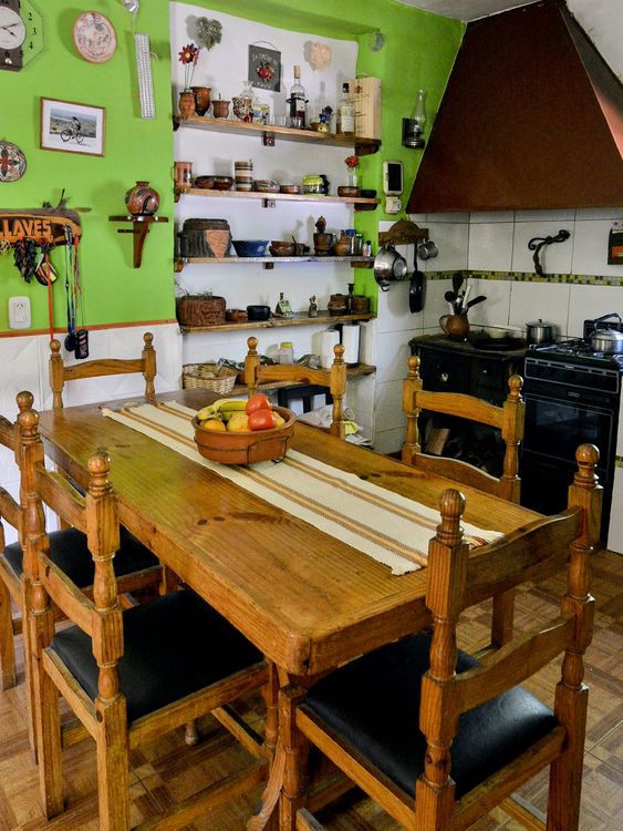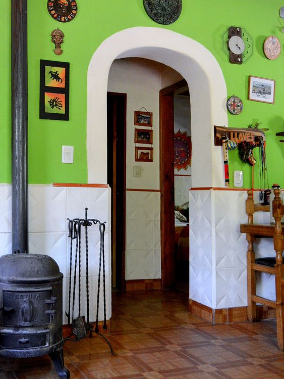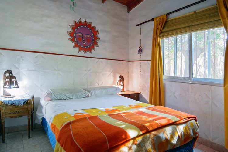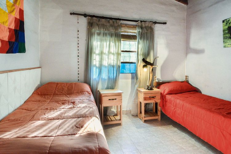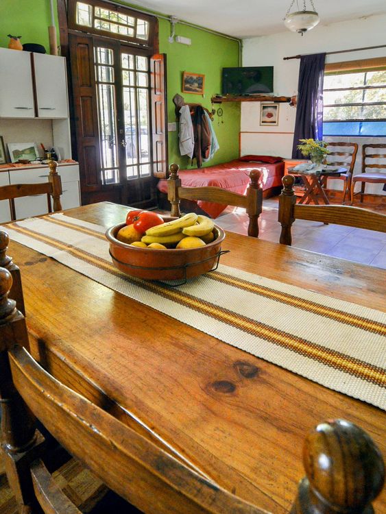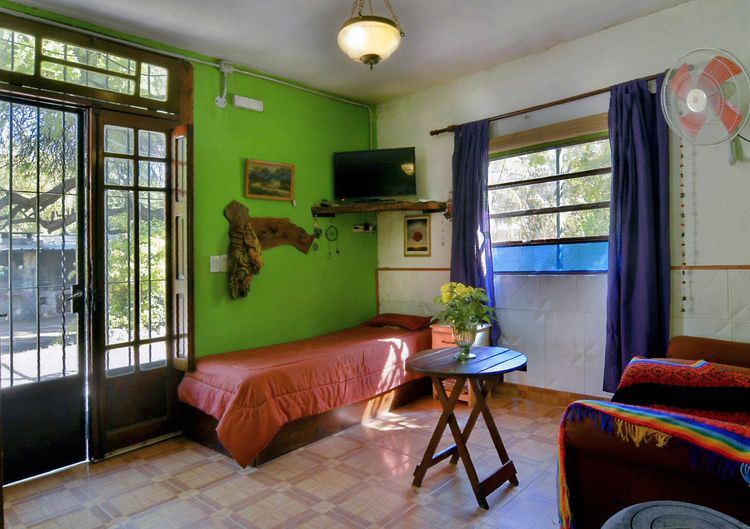 Cuenta con un dormitorio principal con cama dos plazas, ropero, espejo y ventana orientación este con vista a parral y jardín delantero y otro dormitorio con dos camas individuales, ropero y ventana con orientación oeste y vista a jardín trasero de la casa. Cuenta con un gran espacio con sector living con sofá cama de una plaza, sillones, mesita y salamandra y otro sector comedor con una mesa para 5 personas, y cocina completa.